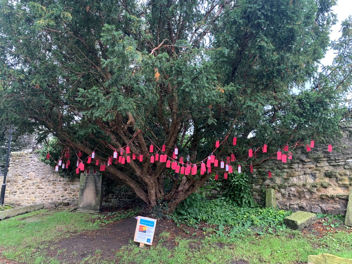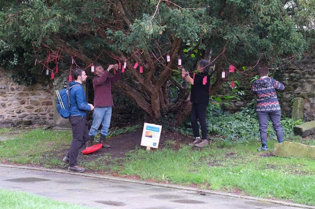The prayer tree at St. Mary’s Barnard Castle where Rev. Canon Alec Harding and Rev. Sarah Cliffe and Rev Canon Eileen Harrop had been placing tags on from the children at Green Land School watched on by Pilgrimage Lead Tom Deakin.